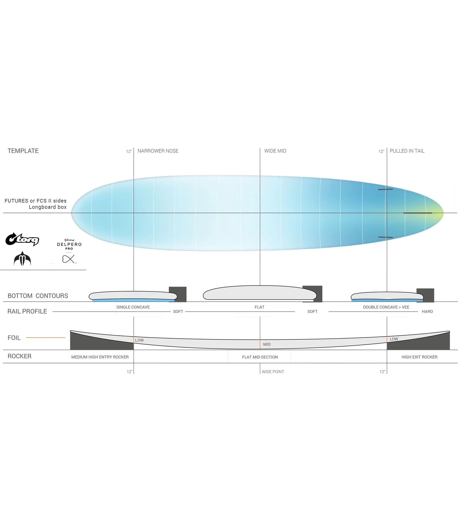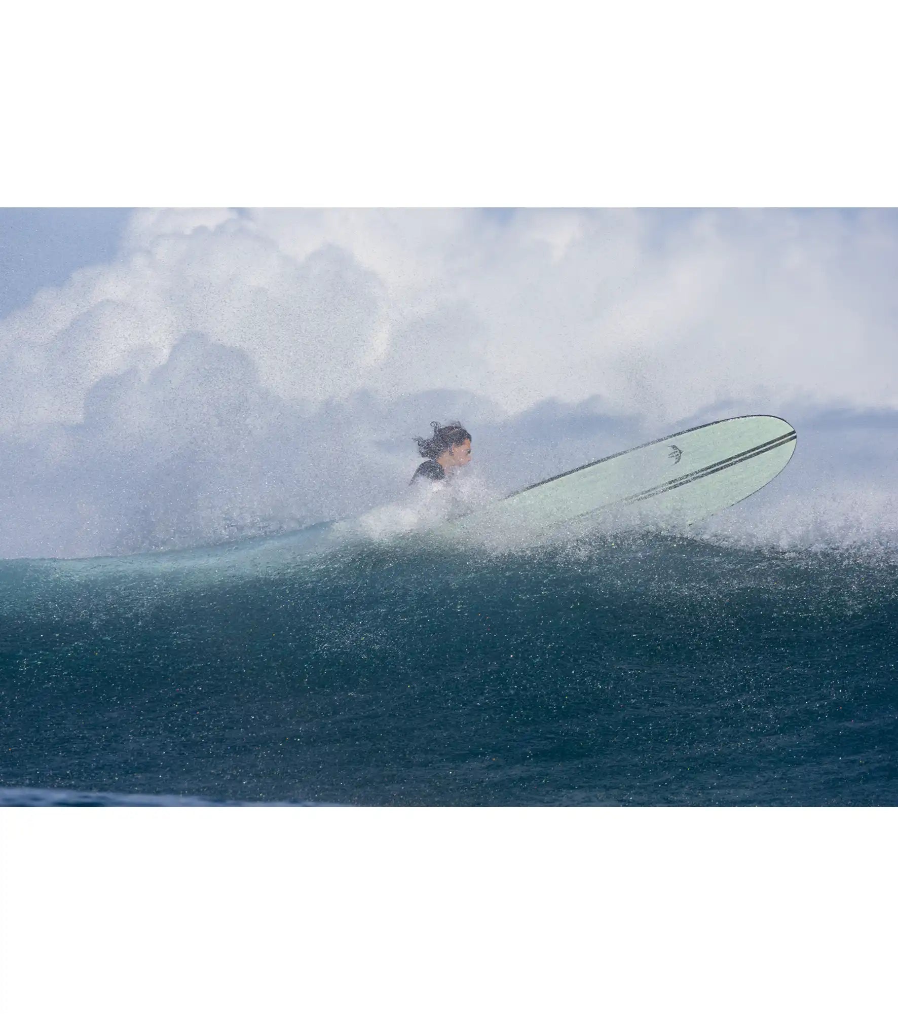 The aggressive outline and rocker will allow you to manœuvre the board at your highest potential while the lift will allow you to hold noserides in critical sections of the waves.