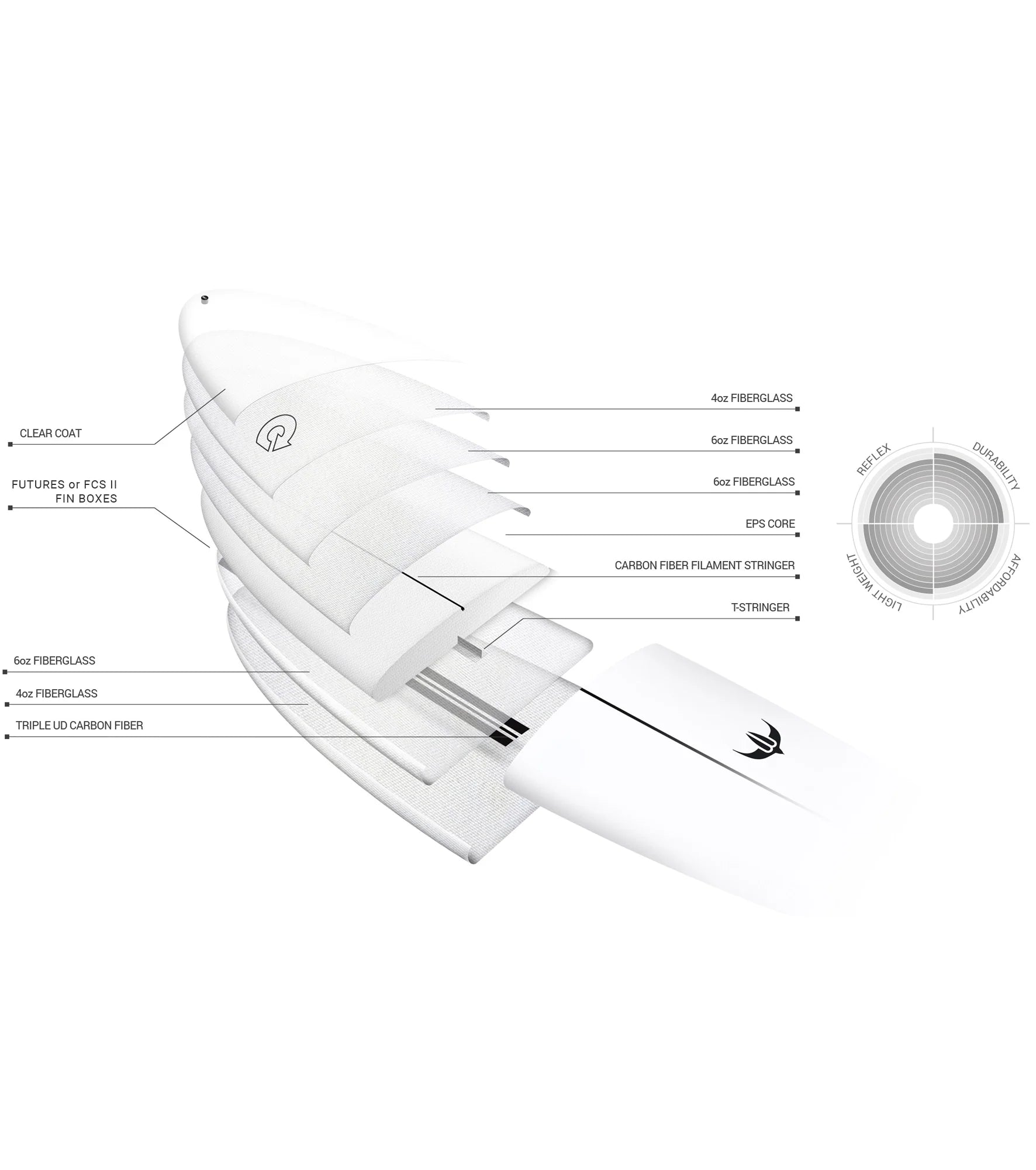We can add extra layers of fiber while keeping the overall weight down – our shortboards have 18oz of fiber on the deck and 10oz on the base – approximately double of the fiber found on most boards of the same weight.