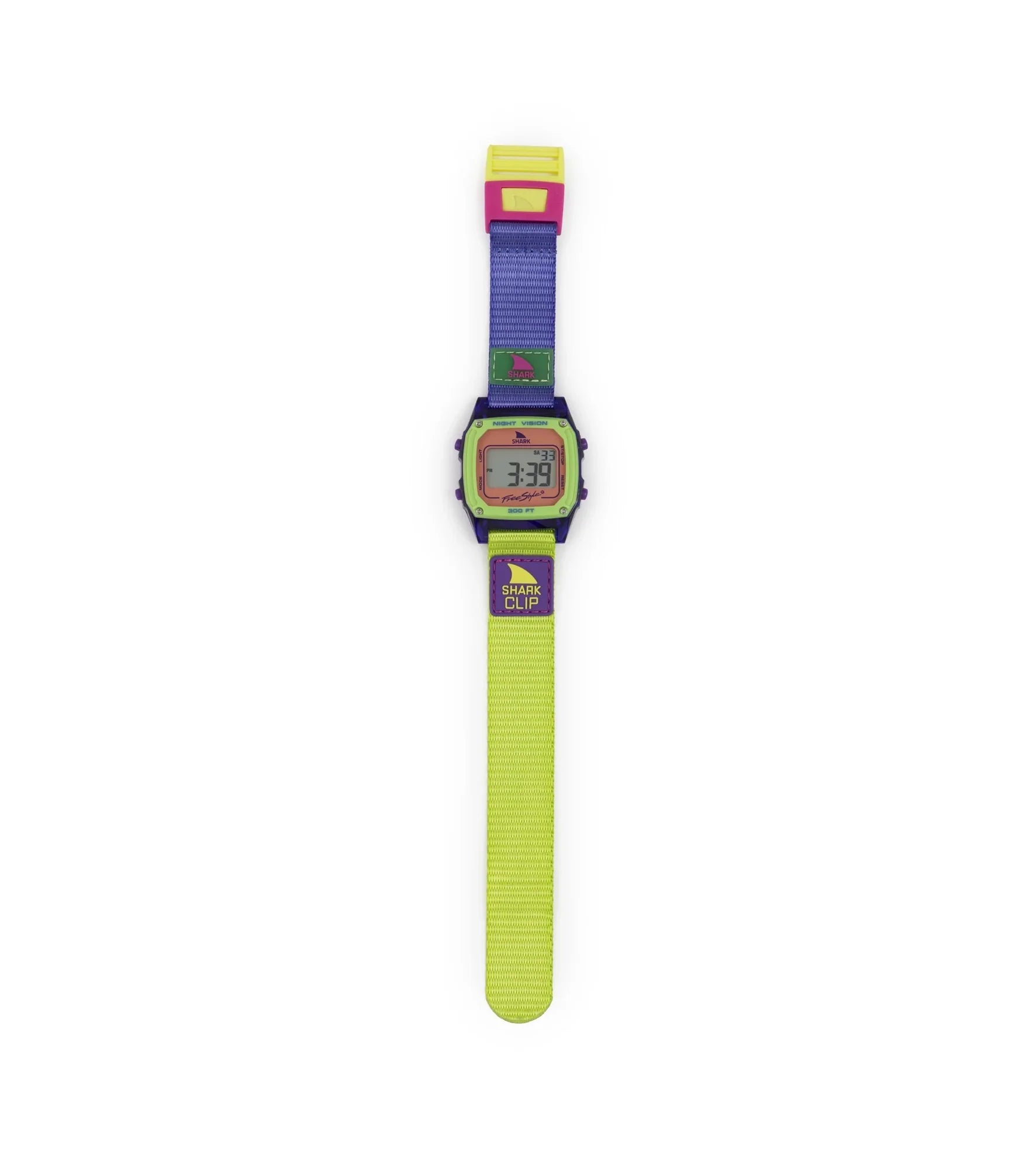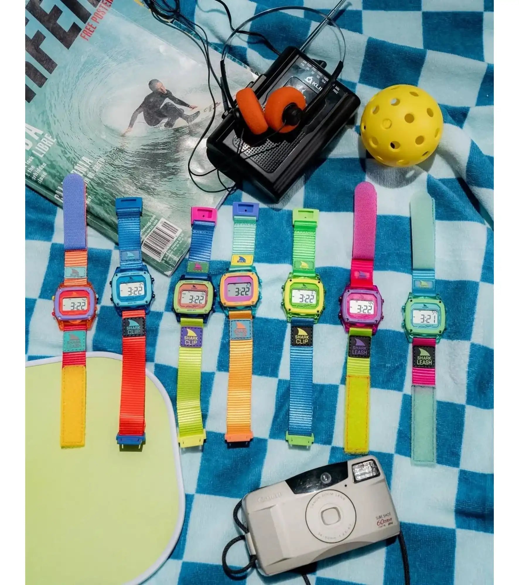 Shark Clip Coastal Heat brings the party to your wrist with a clear blue case and a bold mix of neons, bright color-blocking, and retro-inspired design that feels like wearing a beach sunset. This throwback digital watch delivers serious 90s style with a modern twist.