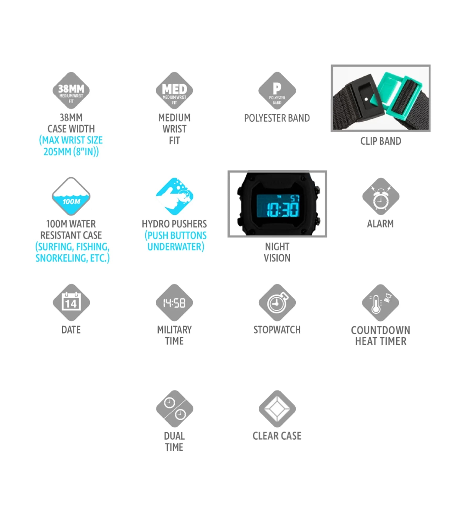 Part of the Freestyle 90s Collection, this water-resistant digital watch is equipped with all the essential features: 100M water resistance, night vision backlight, dual time, countdown timer, alarms, and a stopwatch. Bright, nostalgic, and built for endless summer adventures.