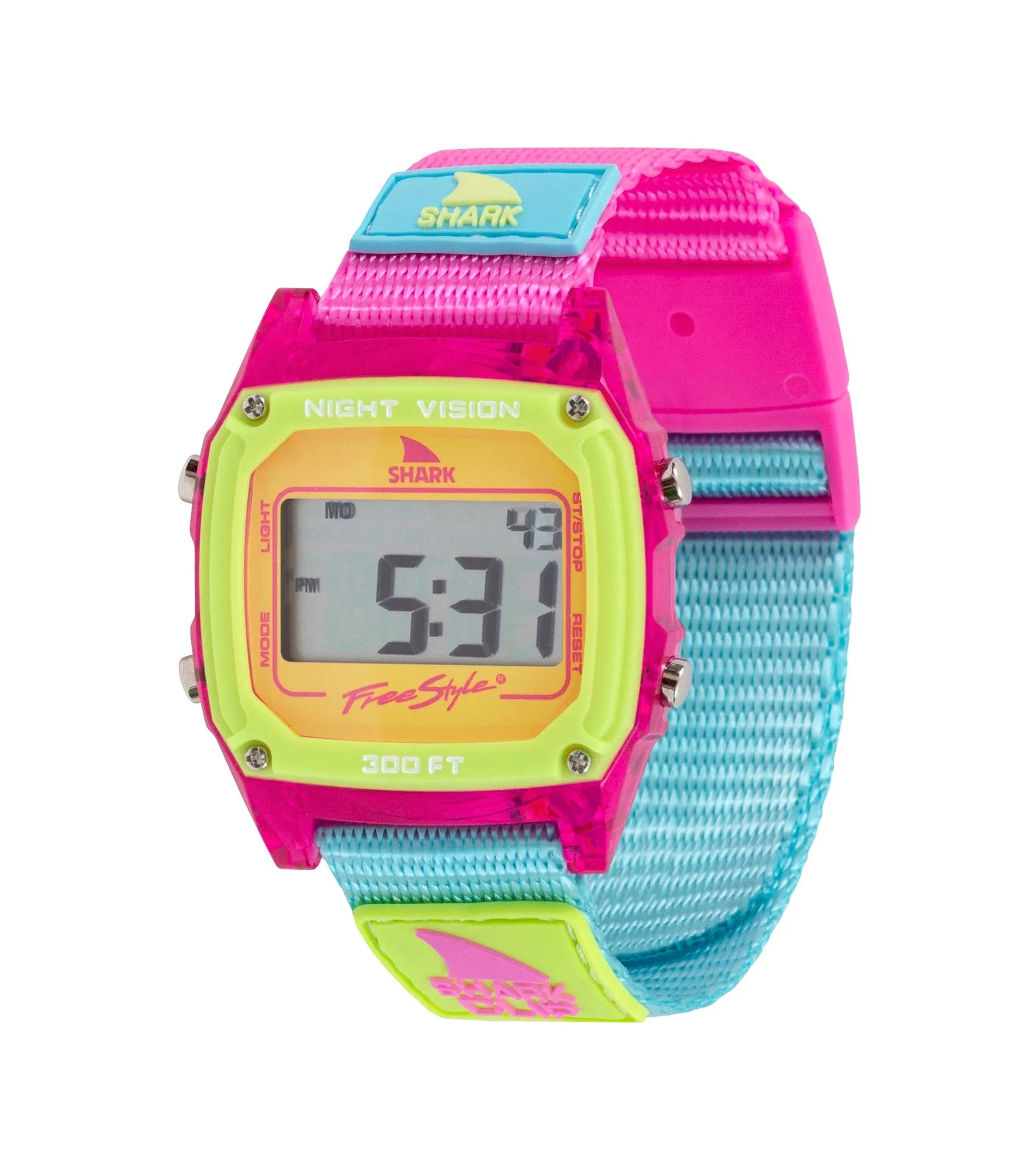 El original desde 1981. La esencia de Freestyle se refleja en la libertad juvenil que nace en la intersección entre surf, sol y diversión. De ese cruce colorido, creativo e irreverente entre la cultura de playa de California y el rendimiento en el océano nacieron Freestyle Watches: una marca icónica y duradera de relojes resistentes al agua, representada por el legendario Shark Watch.
