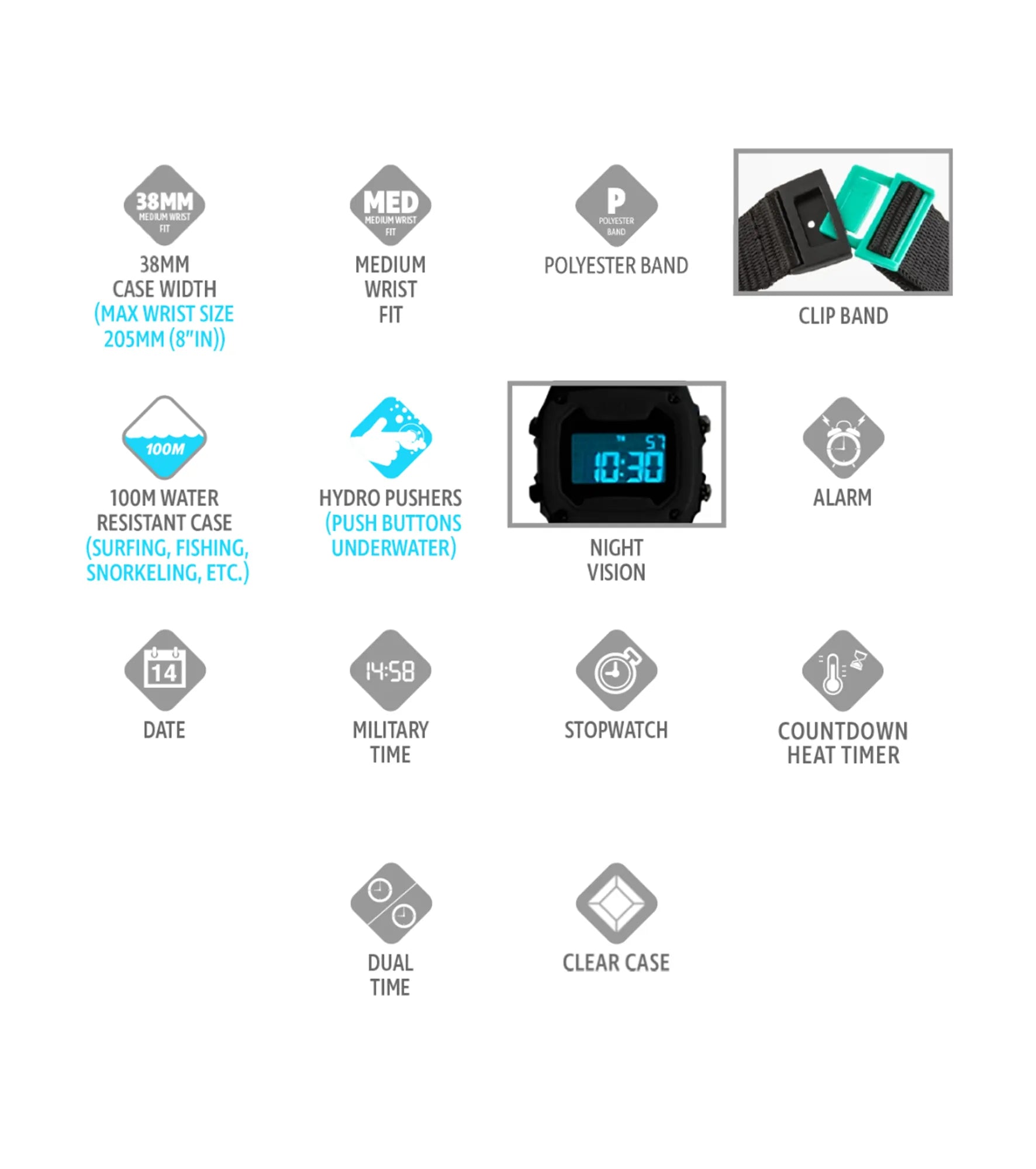 Many models in the Freestyle line have Hydro-Pushers. This means that you can push the buttons under water without worry of getting water inside your watch. Refer to the Details section for your watch to see if it has Hydro-Pushers.