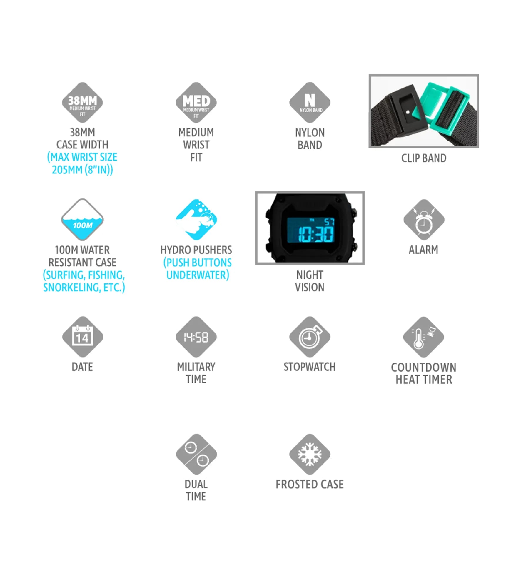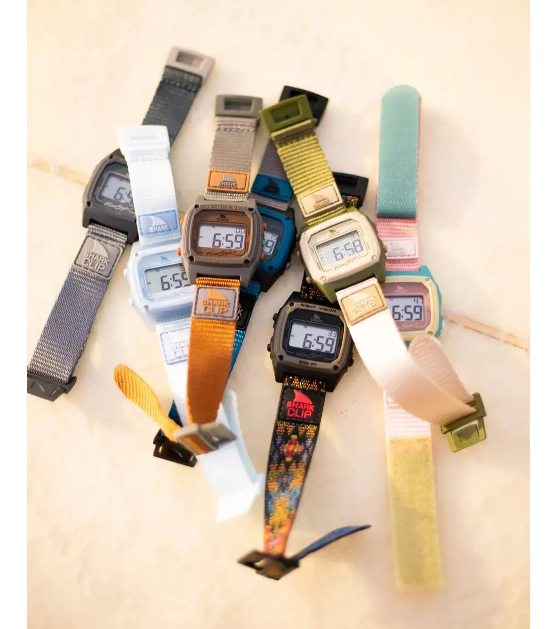 The Shark Clip proudly features our original clip band system that sparked the Freestyle legacy. Just like a trusty seatbelt, clip in to ensure your watch stays secure, snug, and comfortable. Packed with essential digital functions such as time, date, stopwatch, countdown timer, alarm, and a night vision backlight, this watch is equipped for all your needs.