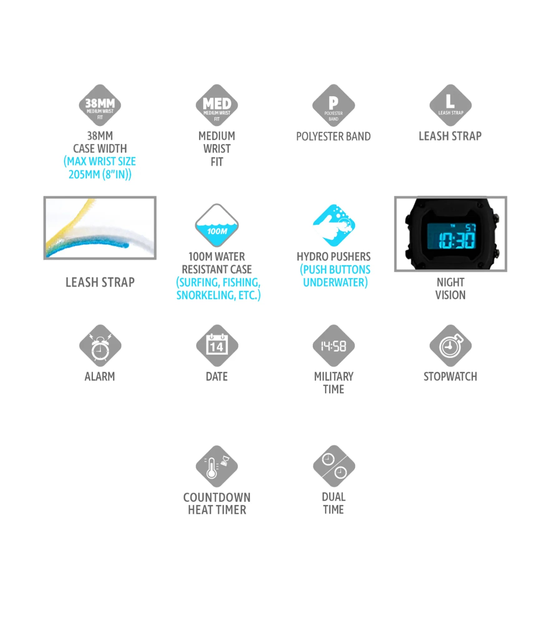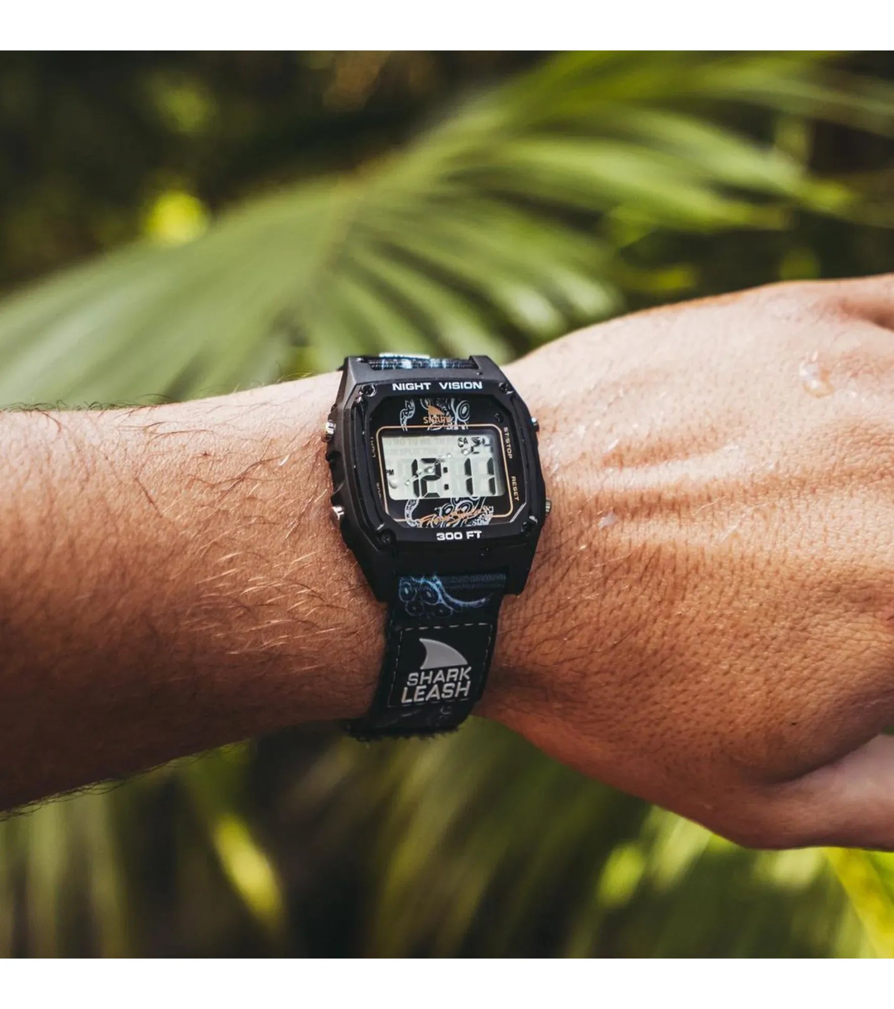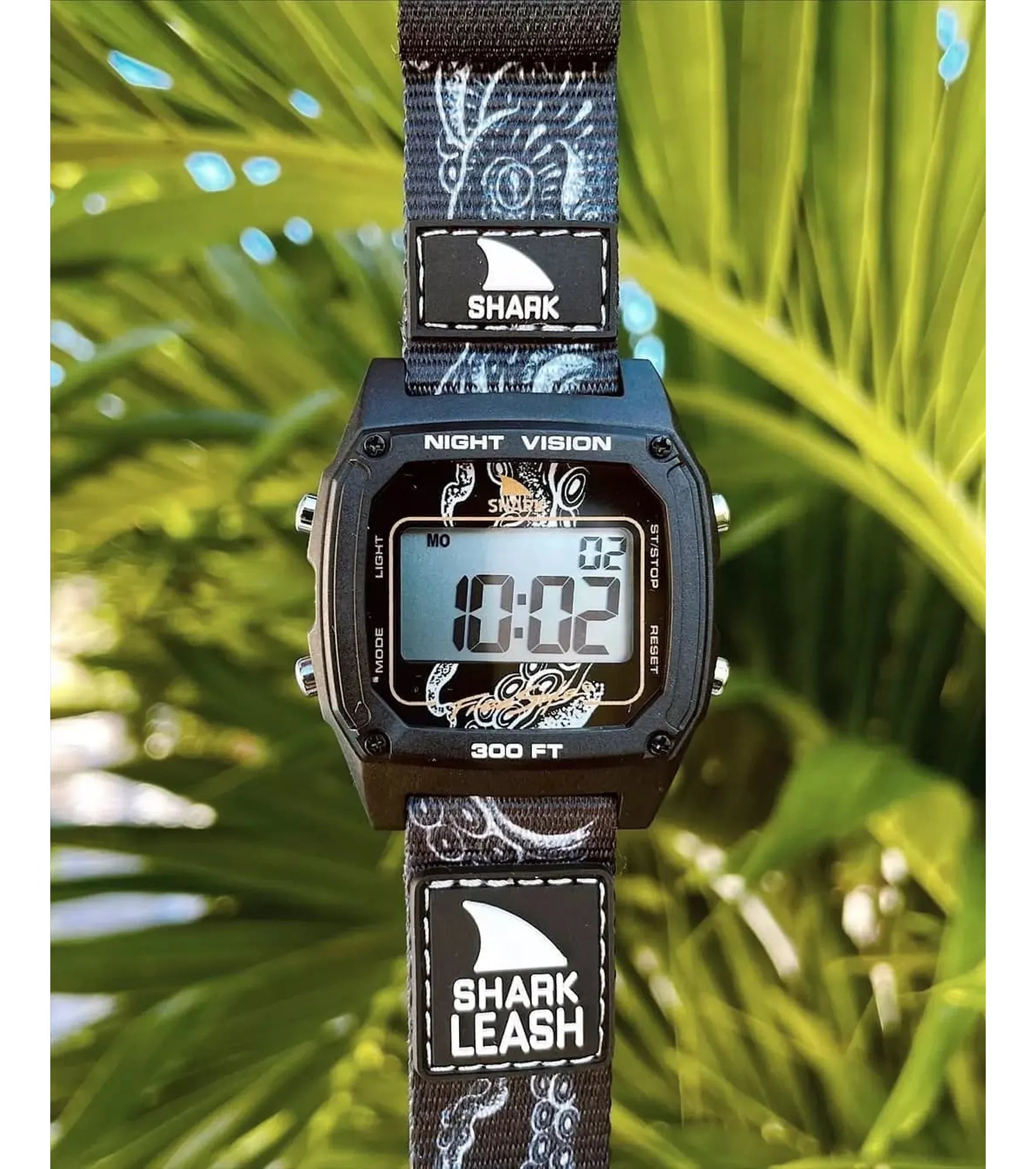 The original Leash band that ignited Freestyle Watches in the late '80s is back and better than ever. The shark leash's hook and loop closure system is modeled after an '80s style surfboard leash, and is ready to get radical. The Shark Leash comes loaded with standard digital features like time, date, stopwatch, countdown timer, alarm and night vision backlight. Like all Freestyle Watches, The Shark Leash is water resistant to 100 Meters and backed by our limited lifetime warranty.