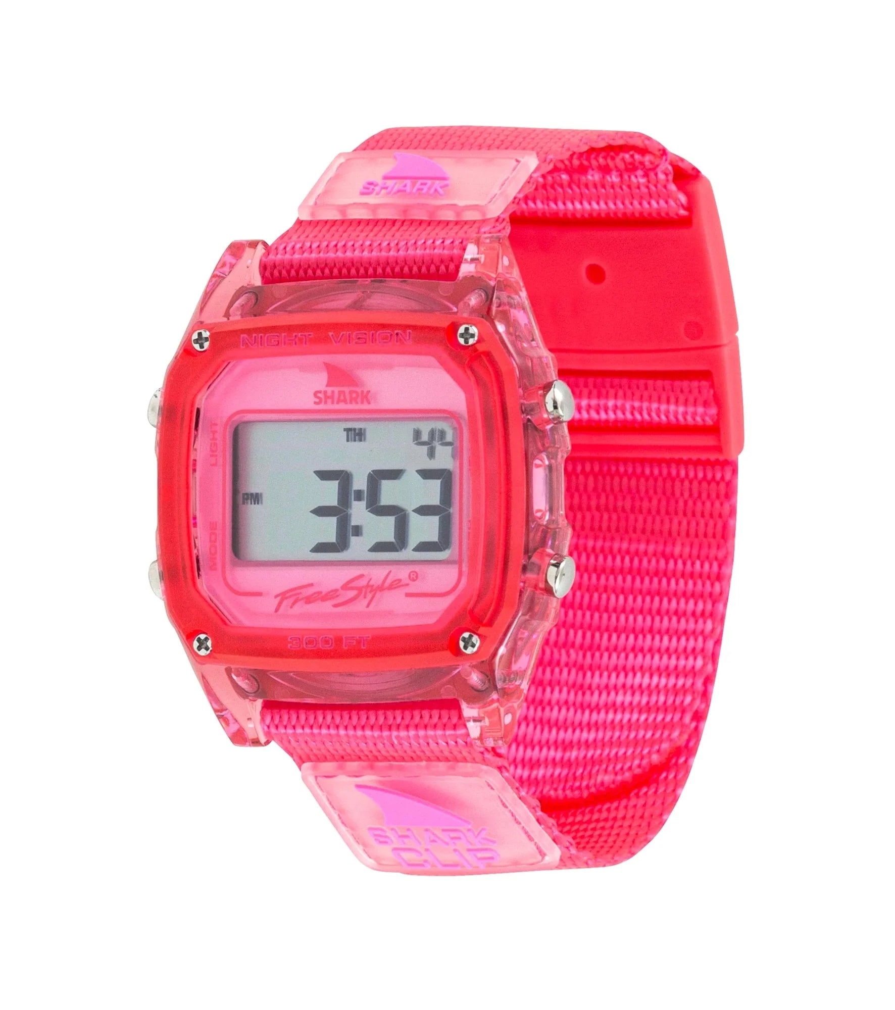 Whether you're surfing the waves or chilling by the poolside, its water resistance up to 300ft and secure Shark Clip closure ensure durability and comfort. Stay organized with digital precision using features such as stopwatch, timer, and alarm, and illuminate your evenings with its convenient backlight. Perfect for collectors and summer enthusiasts alike, the Cherry Shark Clip Watch combines functionality with fashion to elevate your seasonal style.